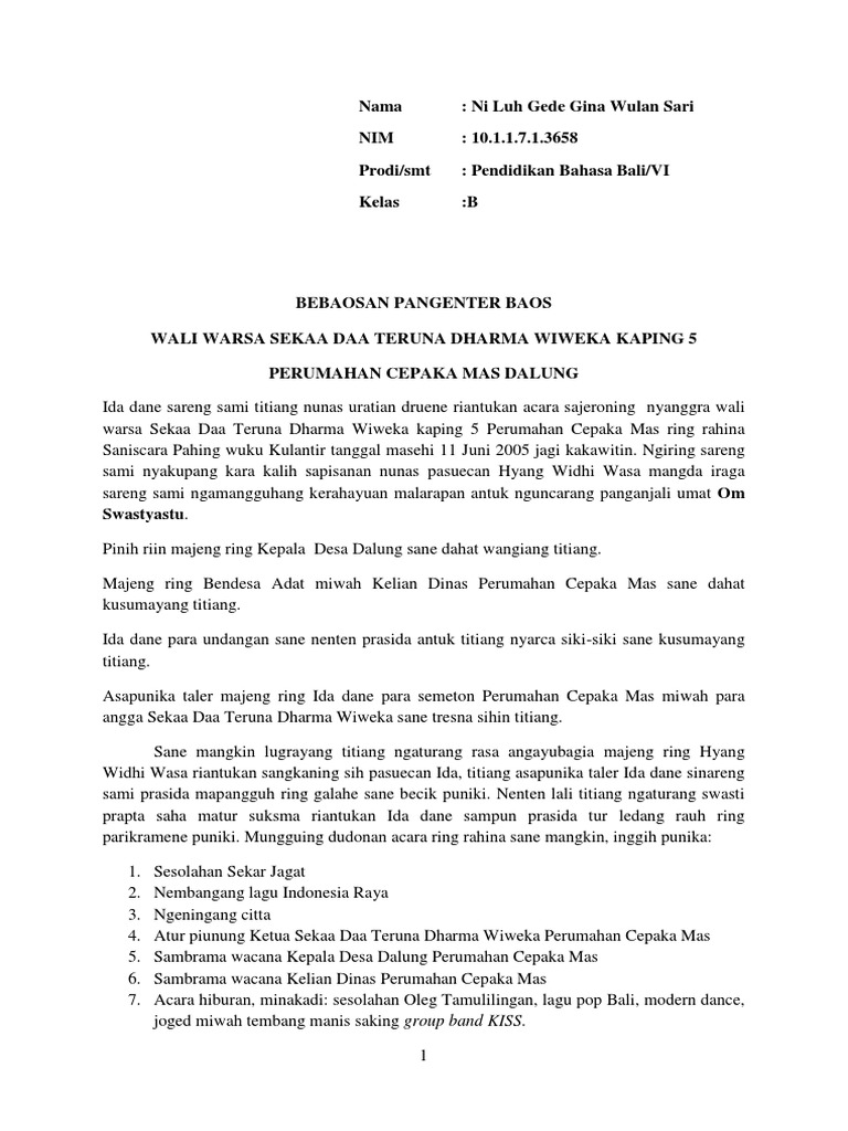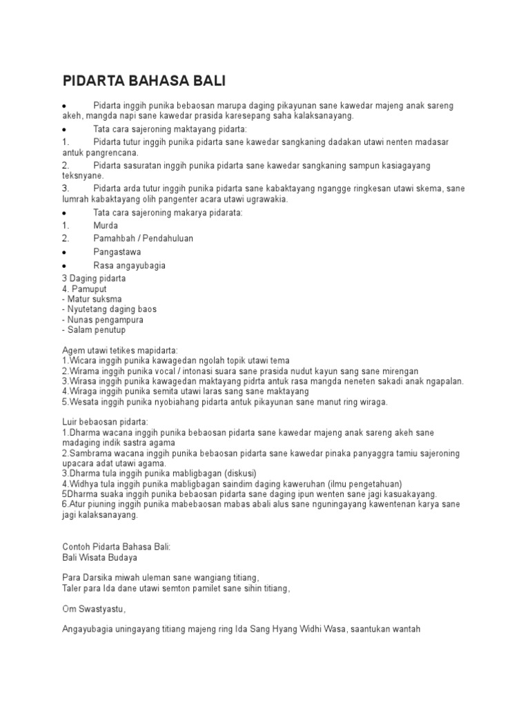 Contoh Teks Pangenter Acara Bahasa Bali Berbagai Teks Penting from lh5.googleusercontent.com Penyuluh bahasa bali sane polih amongan ring desa sanding, kecamatan tampaksiring, kabupaten gianyar, sampun prasida ngamargiang makudang parikrama luire: Contoh pembawa acara berbahasa bali / ugrawakia di smp n 2 kuta. Kreasi dari masing masing kelompok. .עִבְרִית हिन्दी hmong magyar íslenska igbo bahasa indonesia gaelige italiano 日本語 basa jawa latviešu valoda lietuvių kalba lëtzebuergesch македонски јазик malagasy bahasa melayu മലയാള. Bahasa ini banyak digunakan secara luas dalam percakapan di pulau bali oleh masyarakat asli sana. Contoh pangenter acara bahasa bali: Hal ini terjadi karena pengaruh bahasa jawa menyebar ke bali sejak. 23.05.2021 · sewa psk di bali.